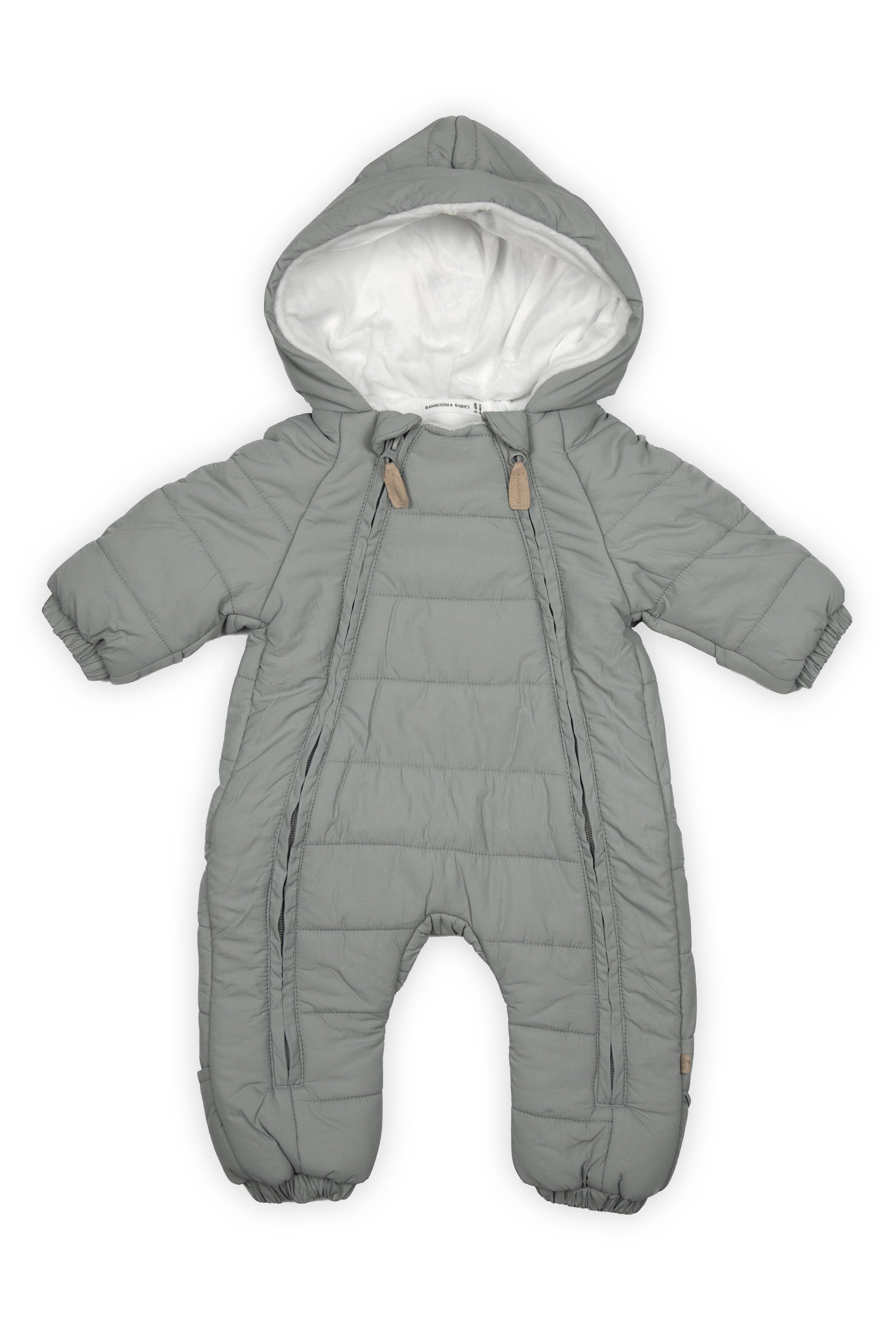 Il sistema di doppie cerniere rende la tuta estremamente facile da indossare e togliere, anche con il bambino in braccio. I risvolti su mani e piedi mantengono il calore all’interno, offrendo un ulteriore strato protettivo nei punti più esposti.